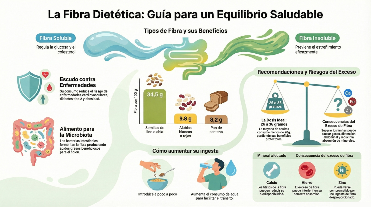 Nota importante: Un incremento tan drástico debe hacerse paulatinamente a lo largo de varias semanas para que la microbiota intestinal se adapte y evitar gases, calambres o distensión abdominal. Además, es imperativo beber entre 1.5 y 2 litros de agua al día para que la fibra funcione correctamente y no cause estreñimiento.